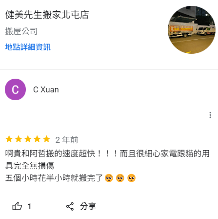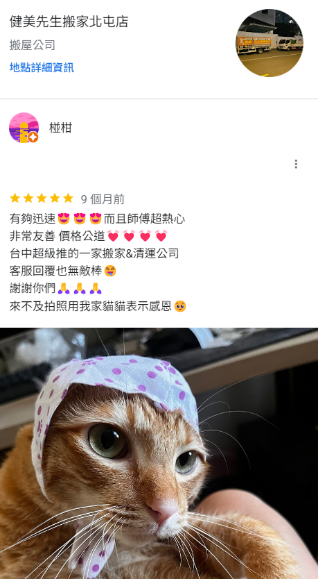帶著狗狗、貓搬家時,請專業人員協助能縮短搬家時長、減少寵物壓力,台中健美先生搬家提供公道平價的專業服務,三個據點在 Google 地圖累計數千則五星好評,以下分享兩則寵物搬家的推薦評論: